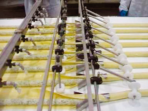 La linea utilizza un cuocitore normalmente impiegato per la precottura di paste ripiene, dotato di un tappeto largo 1500 mm. Dopo la cottura, la sfoglia viene tagliata in strisce longitudinali della larghezza necessaria per il diametro del cannellone da formare.Sulle strisce di pasta viene depositato il ripieno, omogeneo, regolare per ogni striscia e senza interruzioni, per ottenere alla fine cannelloni uguali per peso e dimensioni. Il dosatore del ripieno, alimentato dalla pompa, è stato progettato tenendo in considerazione la regolazione su ogni uscita e il facile smontaggio per la sanificazione a fine produzione. La semplicità costruttiva della soluzione proposta è stata molto apprezzata dal cliente. [hidepost]